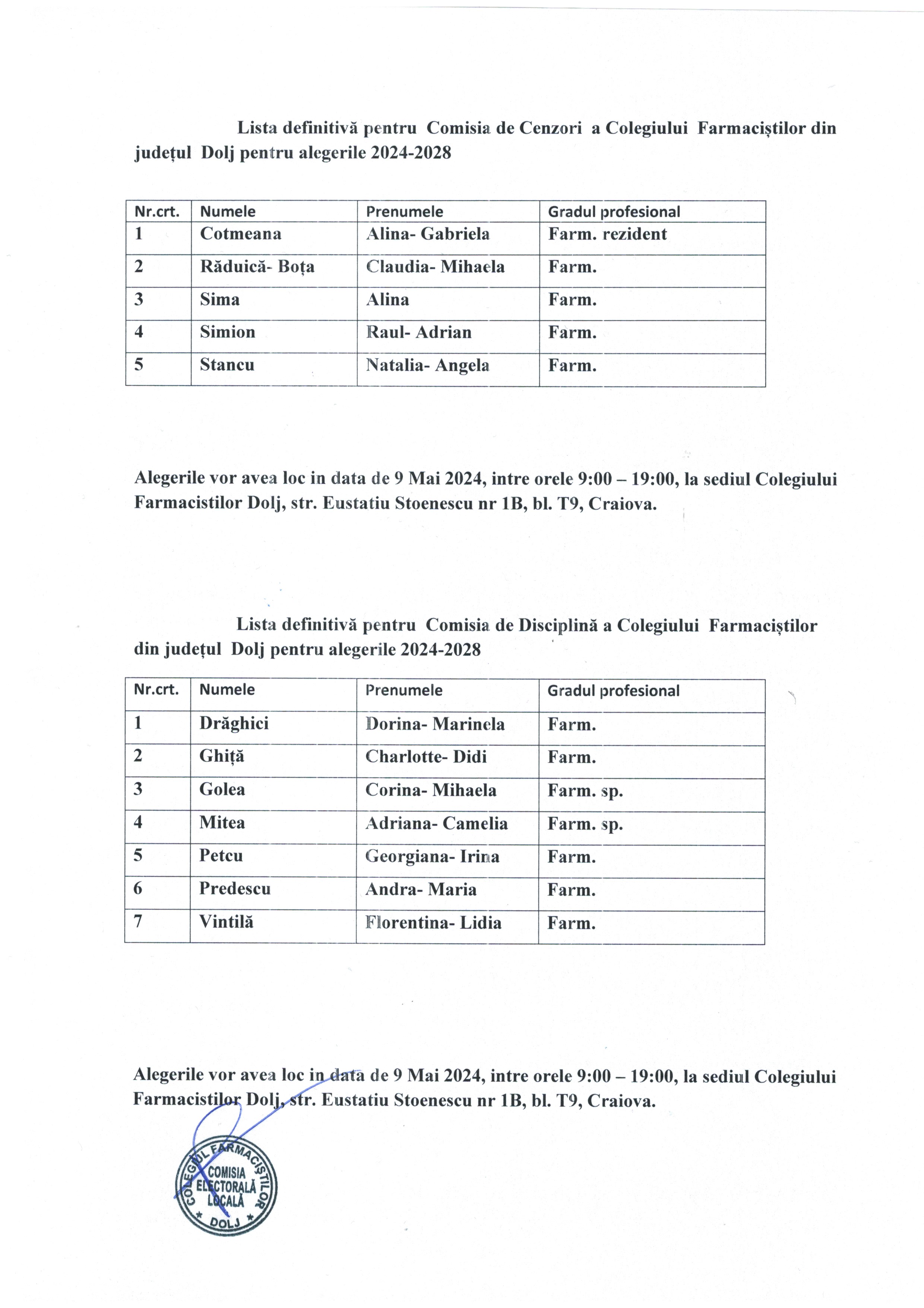 Procesul de vot se va desfășura la sediul Colegiului Farmaciștilor Dolj, Strada Eustatiu Stoenescu, nr.1B, bl. T9, Craiova.